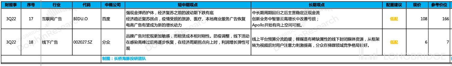 本篇就来先聊一聊广告。年初的时候,我们讲广告股要在不确定性的经济环境下寻找确定的安全边际。而站在现在的复苏拐点,我们则倾向于在长期很难走超宏观经济的广告行业中,更关注业绩修复弹性更高的平台。本篇覆盖的标的主要为纯广告个股,$百度.US 和$分众传媒.SZ 。