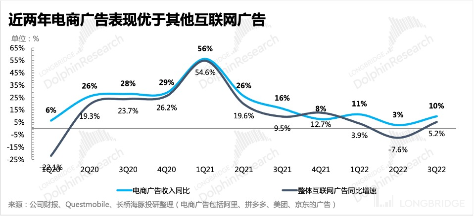 (2)而在经济高度不确定性的 2022 年,除了预算抠门而更依赖效果广告外,因为疫情反复各地不间断的封控,迫于清库存的压力,商家会自然地倾向于将广告投向离交易环节更近,更容易转化销售额的电商平台。因此在今年广告行业整体过于惨烈的情况下,电商平台的广告收入整体仍然保持了正增长。