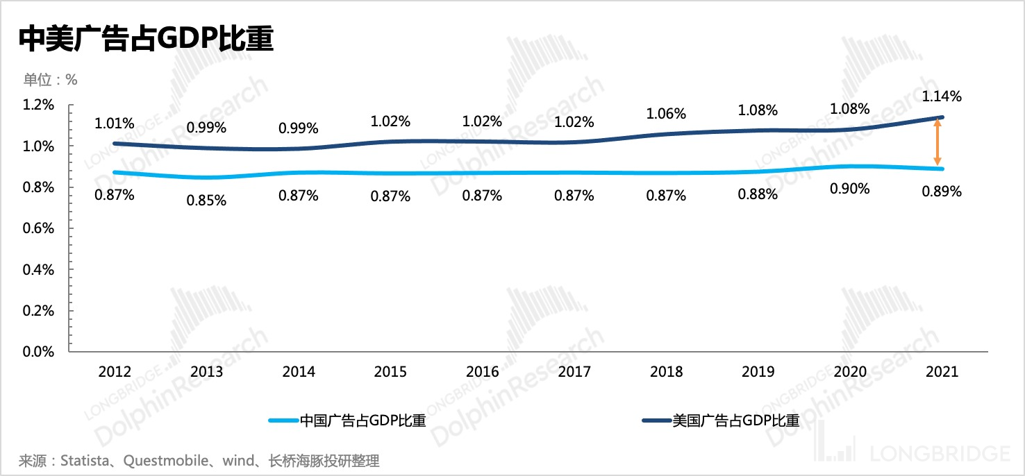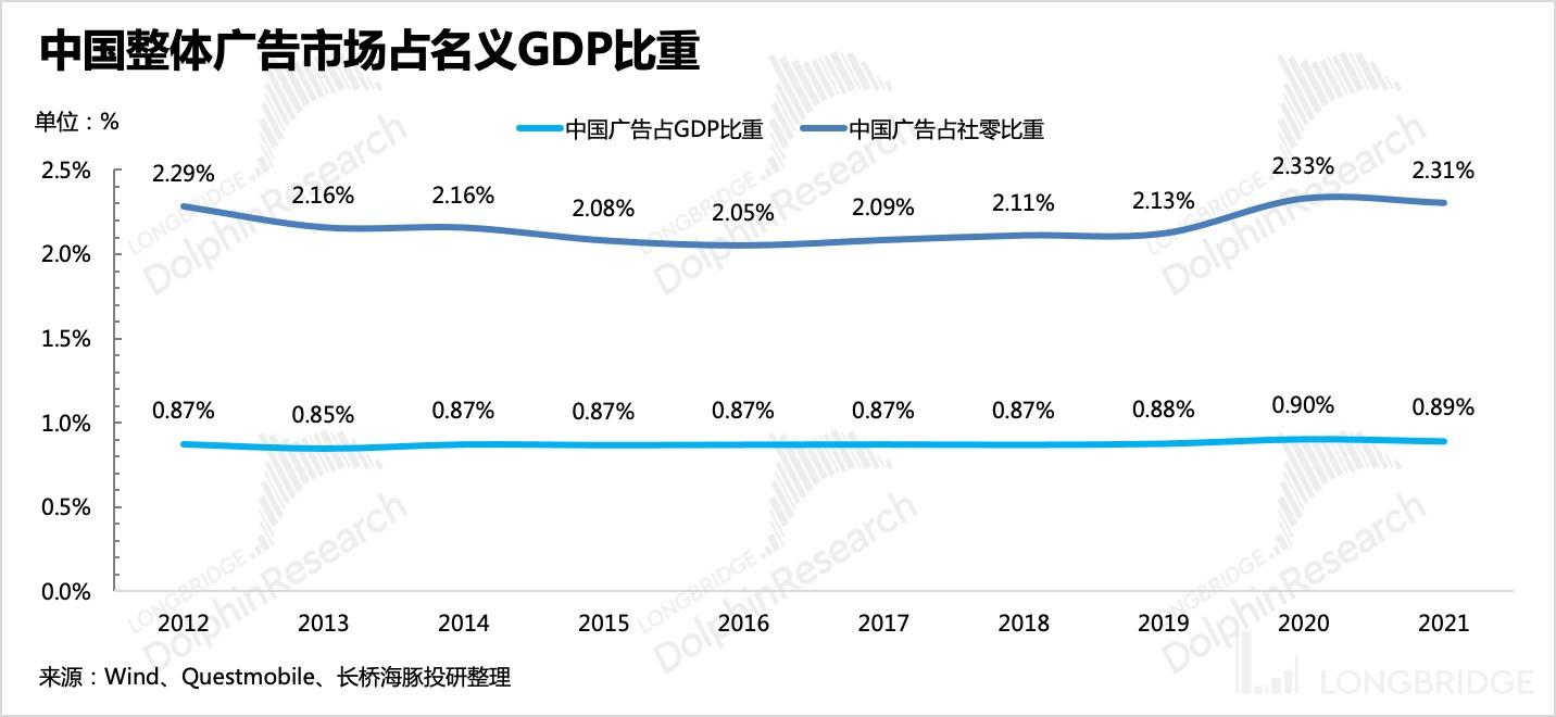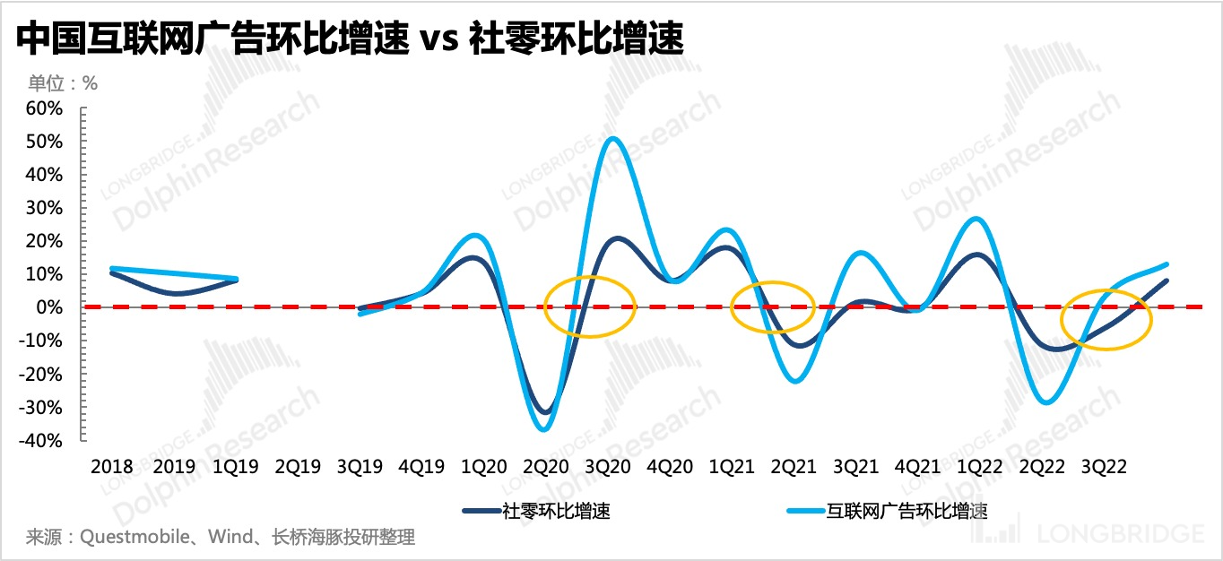 广告是宏观经济的晴雨表,商家的投放预算是基于未来一段时间的消费预期而制定。这也是在《至暗的广告:跌得太惨,不用估值常识就够》中,海豚君反复阐述的逻辑——广告的 “里子”:从长期看,一个成熟的广告行业很难走出超 GDP 的增速,但短期在不同的经济周期拐点上,会出现 “进攻” or“撤退” 的抢跑。