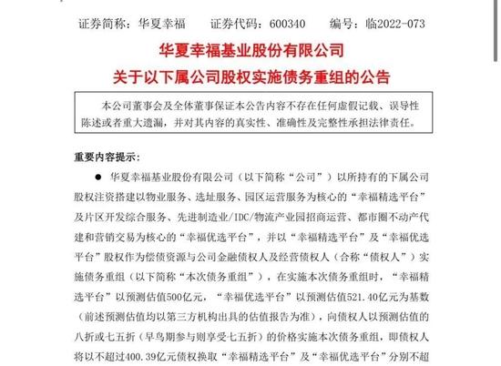 12月19日,华夏幸福公告称,拟以所持有的下属公司股权注资搭建“幸福精选平台”及“幸福优选平台”,并以两平台股权作为偿债资源,与公司金融债权人及经营债权人实施债务重组,债权人将以不超过400.39亿元债权换取两个平台不超过49%的股权或相应收益权。