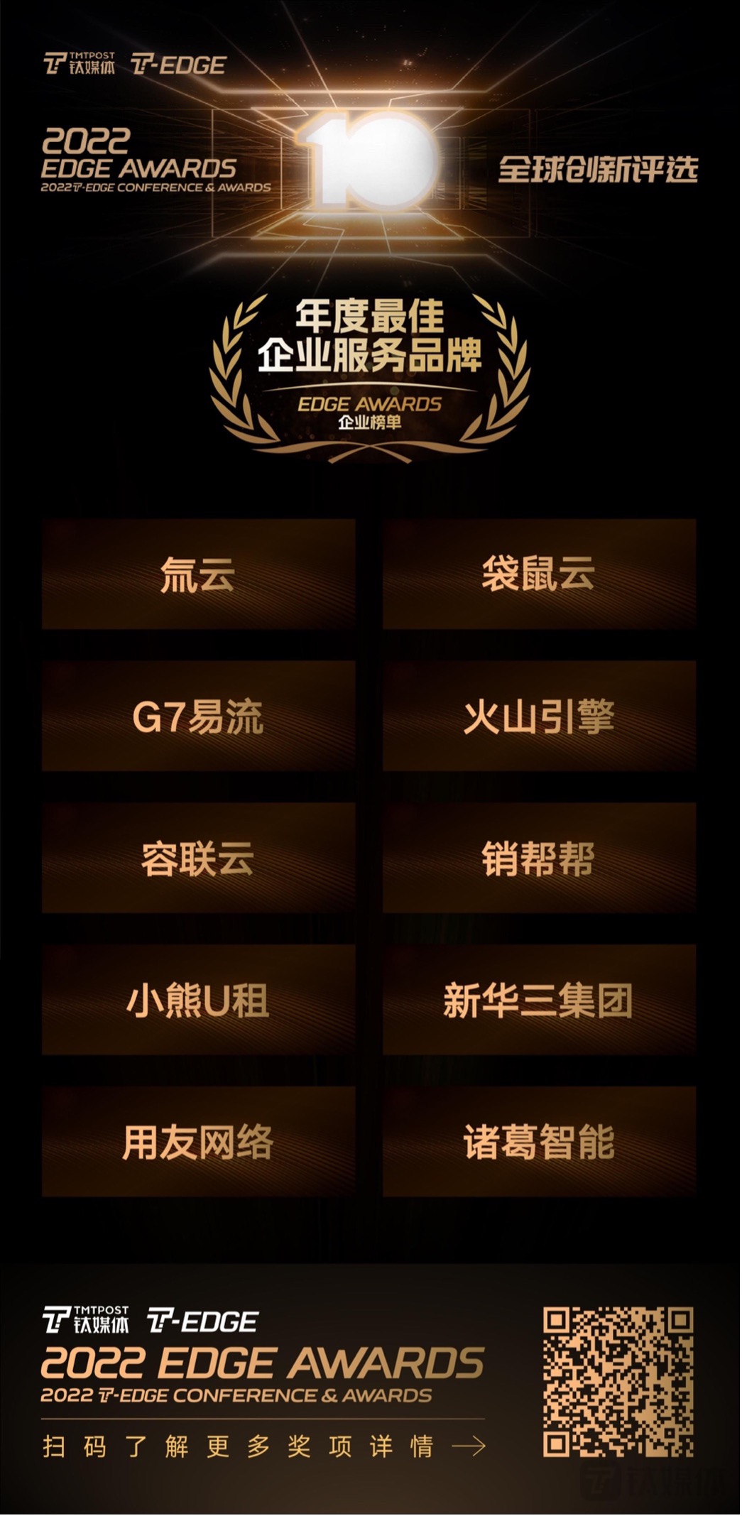 2022 EDGE AWARDS「年度最佳企业服务品牌」也同步揭晓,该奖项颁给2022年度,在云服务、SaaS 服务、数据资产挖掘、行业数字化解决方案等方向做出真正贡献的企业服务厂商品牌。获奖企业包括:氚云、袋鼠云、G7易流、火山引擎、容联云、销帮帮、小熊U租、新华三集团、用友网络、诸葛智能。