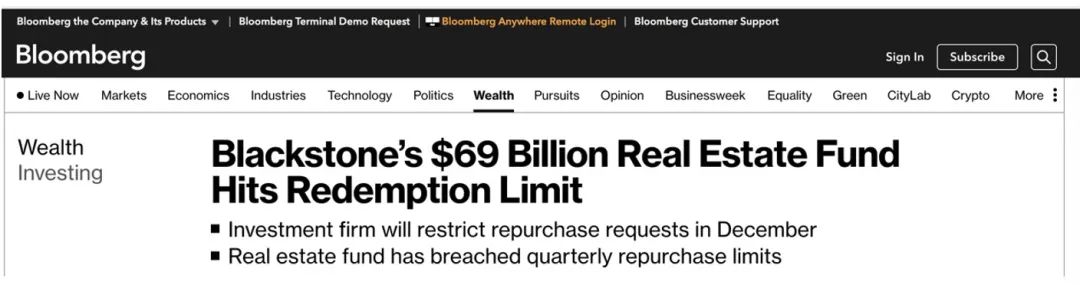 黑石BRIET限制赎回的消息一出之后,大量投资者对于整个地产类基金的风险担忧激增,不仅是黑石,包括喜达屋资本、贝莱德、M&G集团等大量地产类基金这一个月来也都相继进行了赎回限制。