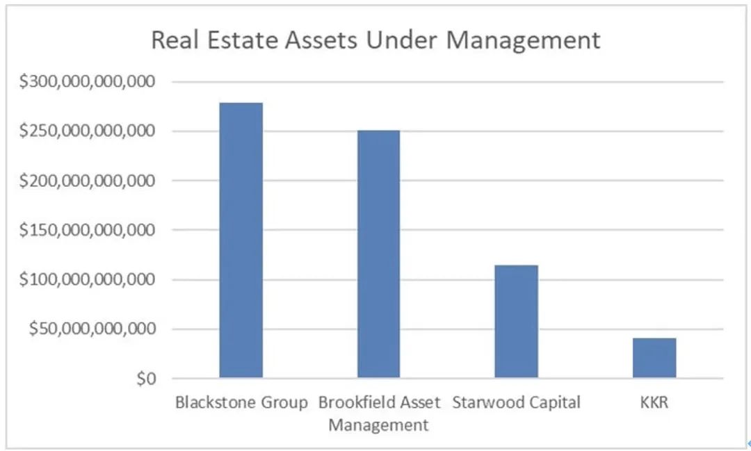截止今年1季度各大资产管理公司的地产基金规模,黑石稳居第一,图片来自the motley fool