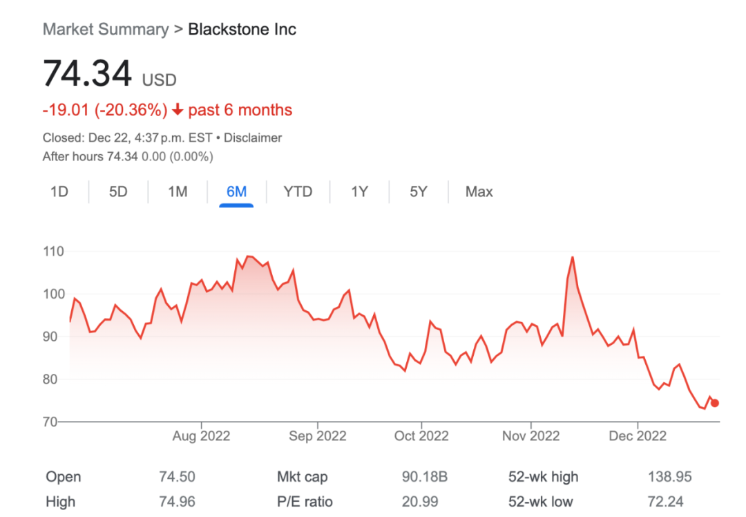 值得注意的是,这已经是黑石连续三个季度的滑铁卢,今年前两个季度,黑石也都出现了亏损。在业绩不佳和赎回风波的影响下,黑石的近几个月来股价也持续下跌,一度下跌超20%。