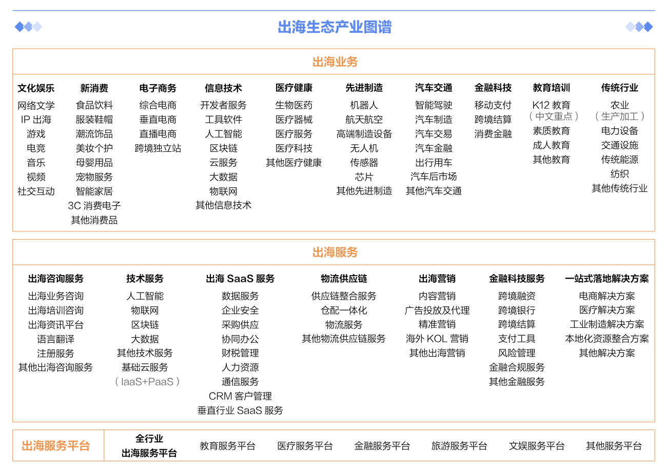 纵观出海生态的全景图,分为出海业务、出海服务、出海服务平台三个板块。前几年,国内企业出海聚焦在出海业务板块,将O2O、游戏、社交、短视频等国内率先跑通的行业进行复制,对于海外来说是全新的玩法,有一定的流量红利,大多为To C业务。