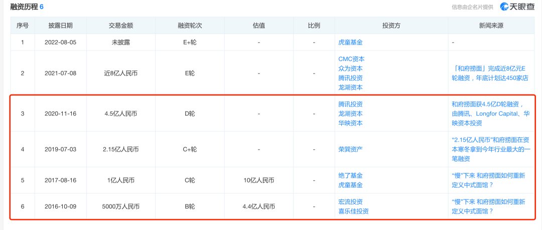 2016年—2020年,和府捞面先后斩获4轮融资 图源:天眼查