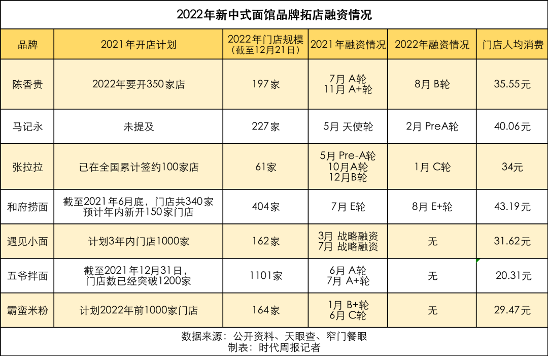 2021年4月,陈香贵、马记永、张拉拉三大新式拉面品牌的门店数,分别达到了22家、15家和3家。到2021年年底时,张拉拉则喊出了已在全国累计签约100家店的消息。此外,遇见小面与湖南米粉品牌霸蛮,也在获得融资后放出了年内或者3年内门店数量达到1000家的消息。