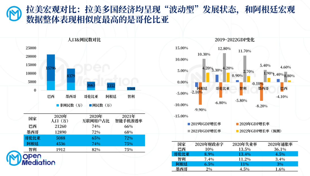 阿根廷经济发展波动大,不确定性强,每个十年内都要波动两三次左右,波动表现为GDP负增长,外债压力剧增、物价剧增、失业剧增、财政赤字,而每次经历两三年的下降之后,又会迎来一次经济复苏,2020年就是这样关键的一年,GDP增长回正,进出口增长,互联网经济也迎来一次较大的增长。如今,到了2022年,阿根廷经济已经进入较为稳定的发展轨迹,内购呈现“回暖至加速增长”的态势。