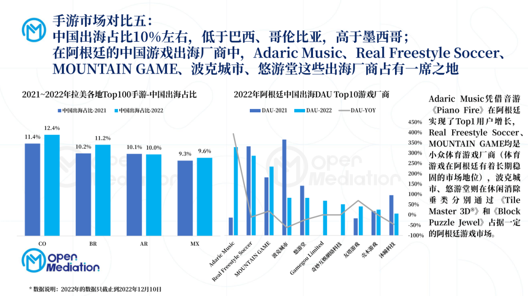 其四,中国出海占比10%左右,低于巴西、哥伦比亚,高于墨西哥;在阿根廷的中国游戏出海厂商中,Adaric Music、Real Freestyle Soccer、MOUNTAIN GAME、波克城市、悠游堂这些出海厂商占有一席之地,在2022年的热门中国出海游戏中,可以发现体育、音乐、消除、帮战是热门题材。