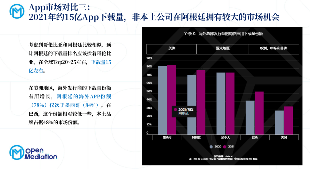 但实际上,就出海而言,大家对于阿根廷乃至整个拉美市场知之甚少。2022年,拉美因巴西、墨西哥出现垂直领域的红利机会而开始受到广泛关注,拉美成为继东南亚之后,第二大全球红利市场。借阿根廷夺冠世界杯之风,我们整体研究了阿根廷App市场,并通过对比阿根廷和巴西、墨西哥、哥伦比亚、智利、委内瑞拉等其它拉美市场,从宏观环境、应用市场、手游市场三个主要方面系统性分析了阿根廷近五年来的市场表现,并产出《2022年阿根廷市场发展报告——拉美重点市场App&手游对比研究》报告。