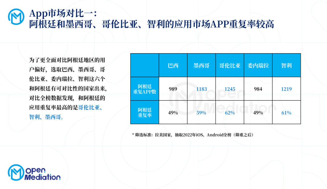 其二,阿根廷和墨西哥、哥伦比亚、智利的应用市场APP重复率较高。