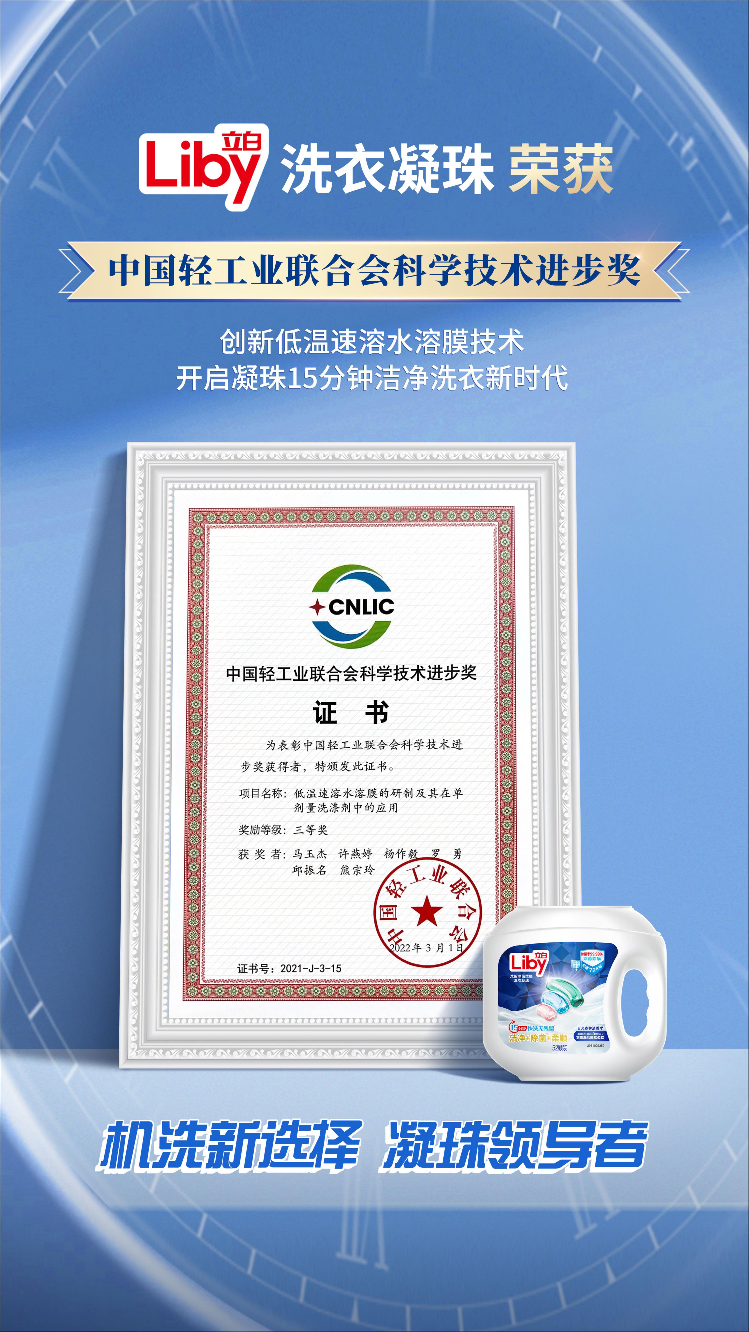 近期,立白凭借《低温速溶水溶膜的研制及其在单剂量洗涤剂中的应用》,荣膺中国轻工业联合会科学技术进步奖。这一技术实现了Liby洗衣凝珠遇水25秒快速溶解,解决了传统凝珠在洗衣机快洗模式下不溶解这一最大难题,经过国家专业机构认证可比常规模式节省70%水量和电量,补齐洗衣凝珠对比洗衣液的最后一块短板。