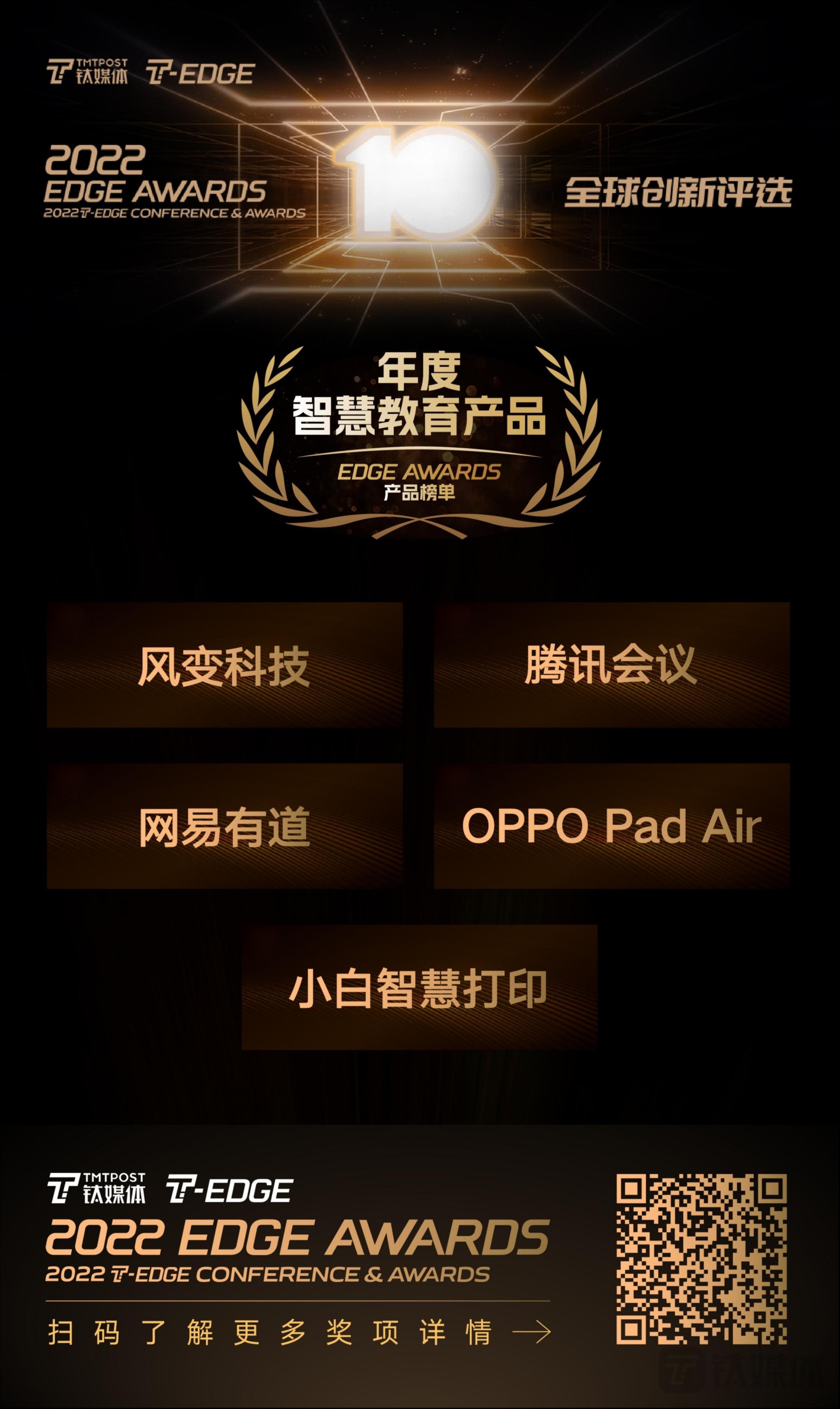钛媒体一直致力于教育领域的未来发展与探索,特颁发2022 EDGE AWARDS全球创新评选之「年度智慧教育产品」榜单,以表彰那些在教育领域独具创新且具有广泛应用价值的产品,它们通过整合新技术、软硬件、教育资源,在当下的教育市场表现优异,引领产品发展方向。获奖产品包括:风变科技、腾讯会议、网易有道、OPPO Pad Air、小白智慧打印。