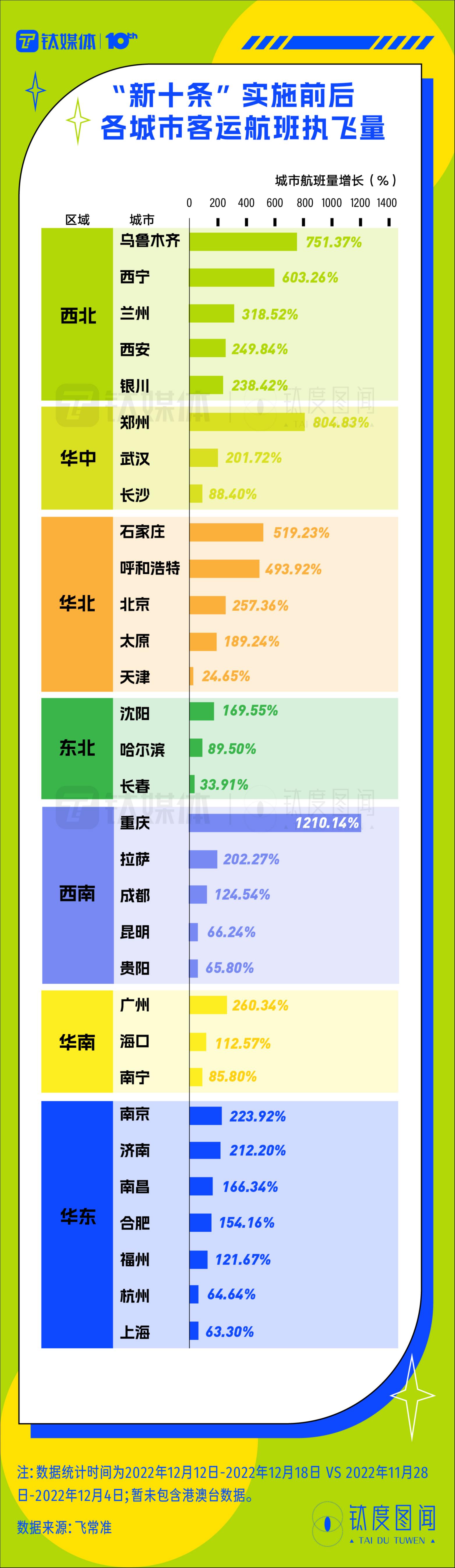 从区域上看,通过对比最新一周的航班量(12.12-12.18)和“新十条”实施前一周(11.28-12.4)航班量数据,西北地区各城市国内客运航班执飞量增长皆超过200%以上,成为疫情放松管控后最大的受益区域市场。在31个省市自治区中,重庆的航班量增幅最高,增长1210.14%;其次,郑州、乌鲁木齐两地客运航班执飞量涨幅也很明显,分别上涨804.83%和751.37%。