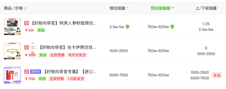 下午场销售量最高的产品为售价299元的阿芙人参籽胶原抗皱复颜护肤礼盒臻颜紧致保湿D3,总销量是2.5万-5万,最终的销售额在750万至1000万。