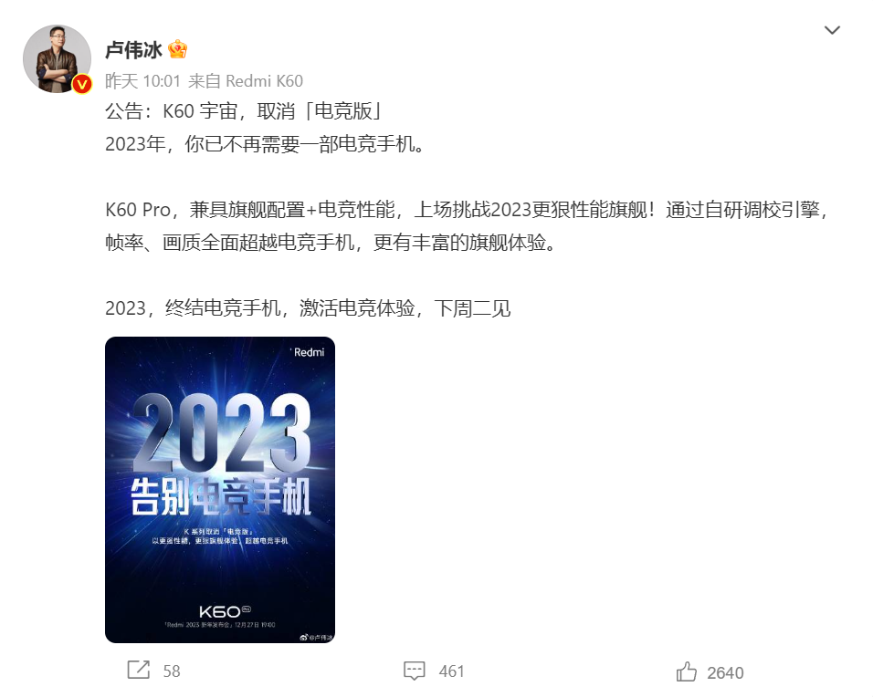 日前,Redmi宣布定档12月27日召开K60系列发布会,即将升任小米集团总裁的卢伟冰随后在微博发布公告称,K60系列将取消电竞版,「2023年,你已不再需要一部电竞手机。」