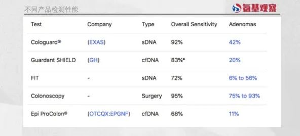 Cologuard对早期结直肠癌的敏感性分别为92.3%,对腺癌的敏感度为42%,遥遥领先。