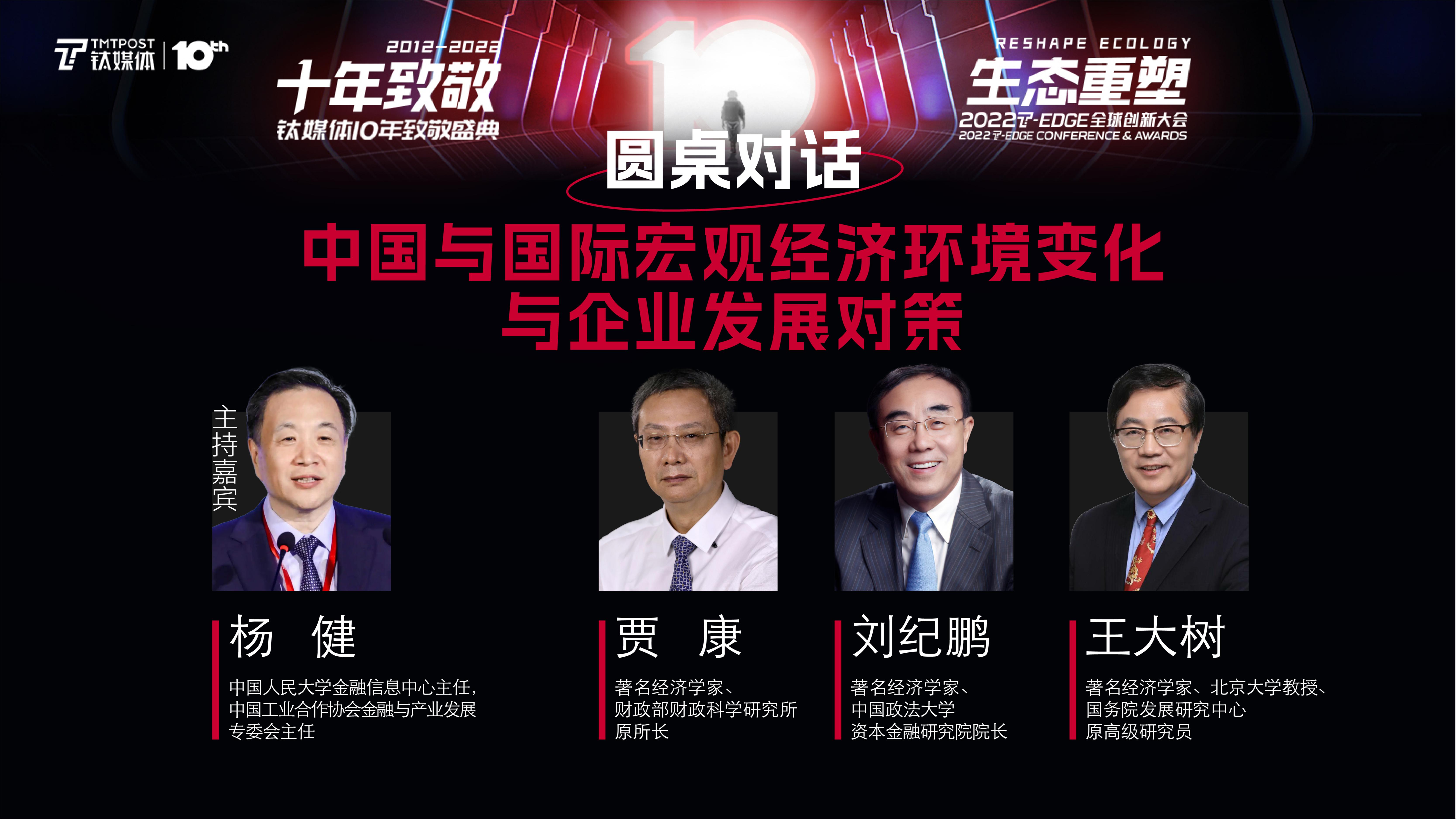 12月23日,在钛媒体2022T-EDGE大会上,中国人民大学金融信息中心主任,中国工业合作协会金融与产业发展专委会主任杨健作为主持人,与著名经济学家、财政部财政科学研究所原所长贾康;著名经济学家、中国政法大学资本金融研究院院长刘纪鹏;北京大学教授、著名经济学家、国务院发展研究中心原高级研究员王大树围绕中国企业发展现状展开了深入对谈。