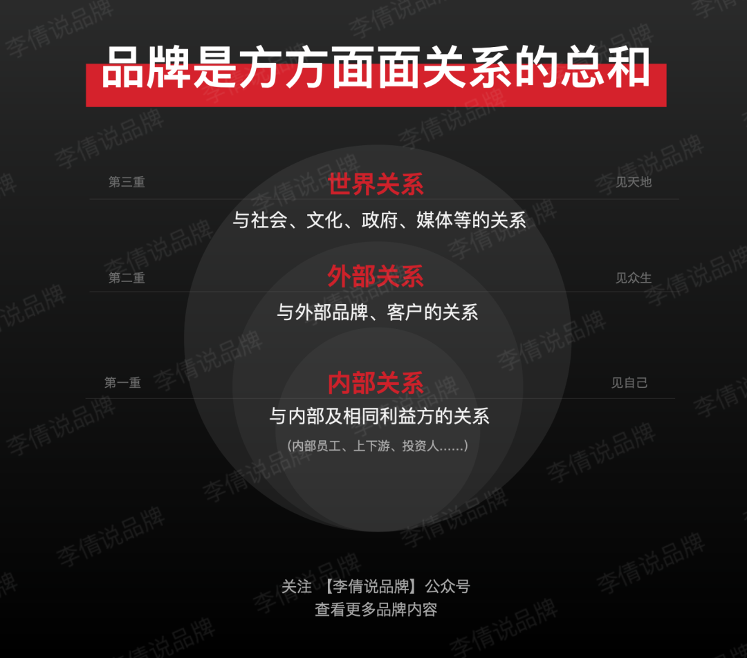 我的工作室叫关系品牌事务所,为什么是关系品牌呢?因为我认为,品牌是方方面面关系的总和。借用电影《一代宗师》里章子怡的一句台词:习武之人有三重境界:见自己、见众生、见天地。一个品牌也会有三重关系:内部关系、外部关系和世界关系。