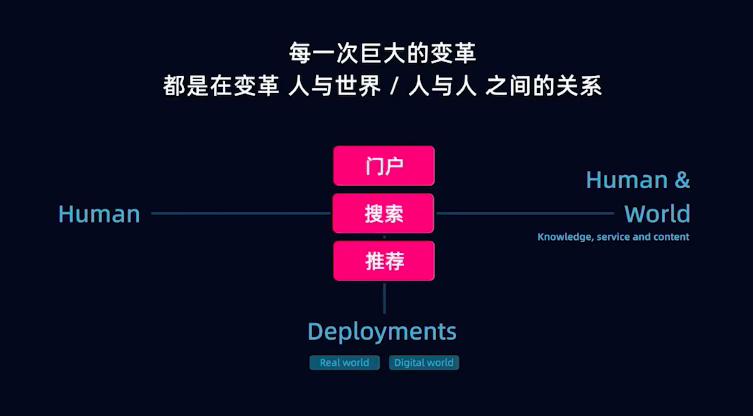 关于人和世界的关系,大家可以看到曾经有一个时代是门户时代,通过门户去连接人和世界信息还有知识;再进一步出现了搜索引擎,相比门户更多是信息结构化的效率改变。换句话说把连接人和世界的搜索引擎设想为“管道”,搜索引擎能够更好地从管道里拉取信息为人提供服务;在之后出现的推荐引擎,不再是拉取的方式,而是通过人的理解以及更好的结构化知识,将信息推送给人。
