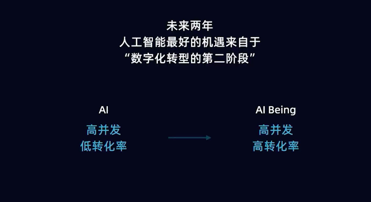因此数字化转型的下一阶段,不再是粗放式与用户进行数字化接触,而是用人工智能将这种接触产生实际的效果。过去,通过人工智能技术的引入可以更高并发获取用户,但对用户的转化率是相对比较低的,而下个阶段,从AI到AI Being,在保持高并发获取用户的系统优点的同时,还会大大提升用户的转化率。