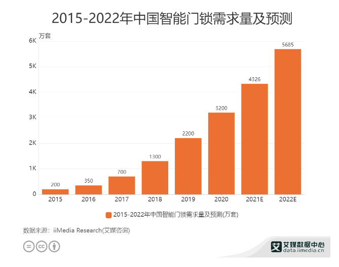 艾媒咨询数据报告显示,2015-2022年中国智能门锁需求量从200万套上升到2021年的4326万套,预计2022年将达到5685万套。