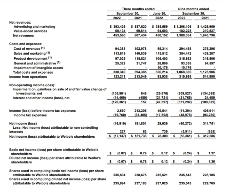 近期,微博发布了2022年Q3季度财报:微博Q3季度总营收达到4.54亿美元,同比下滑25%;非公认会计准则经营利润为1.621亿美元,同比下降34.8%;具体到各业务,微博广告及营销收入3.934亿美元,同比下降27%;增值服务收入6010万美元,同比下降14%。