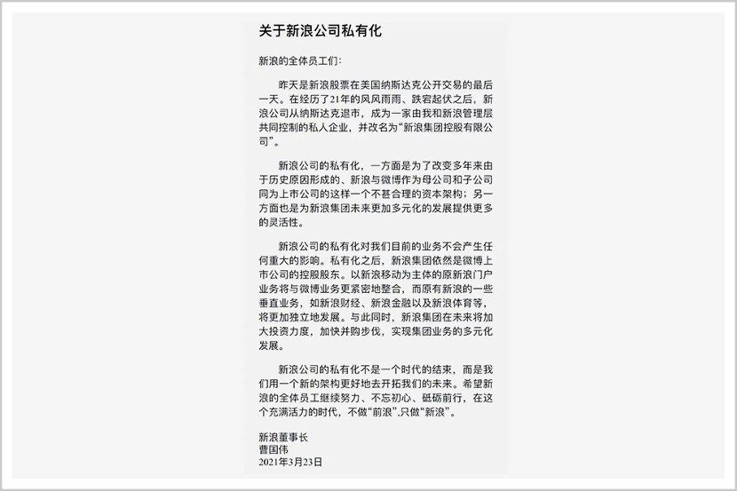 新浪董事长曹国伟发布一封全员信强调新浪私有化原因:“为了改变多年来由于历史原因形成的、新浪与微博作为母公司和子公司同为上市公司的这样一个不甚合理的资本架构……私有化之后,新浪集团依然是微博上市公司的控股股东。”