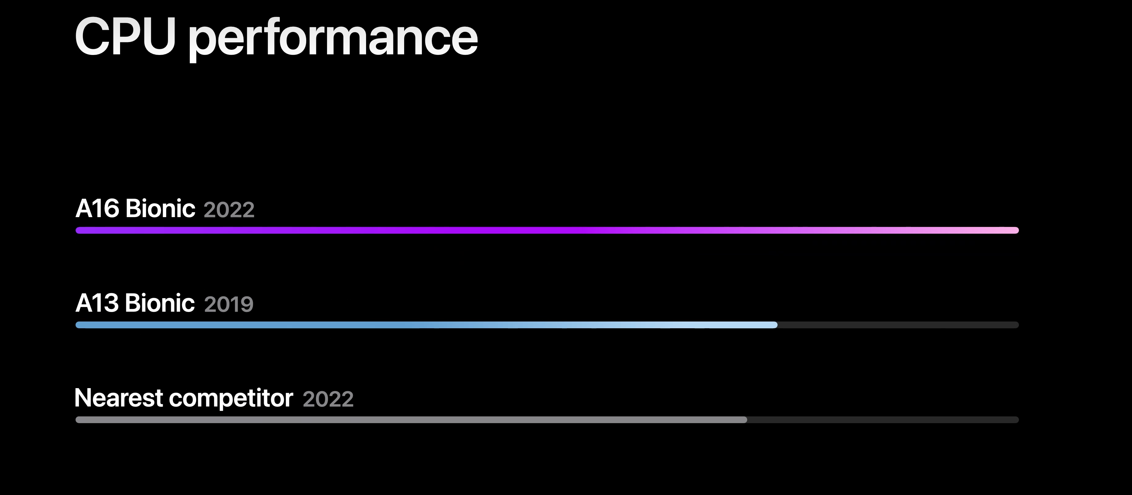 A16到底拉胯到什么地步呢?就连苹果在发布会上都不敢拿它跟A15做对比,而是请出了三年前的A13,好让A16的PPT数据看起来更“唬人”。但当消费者拿到iPhone 14 Pro并进行了详细的性能测试后才发现,所谓的A16处理器不过是A15的换皮版罢了。