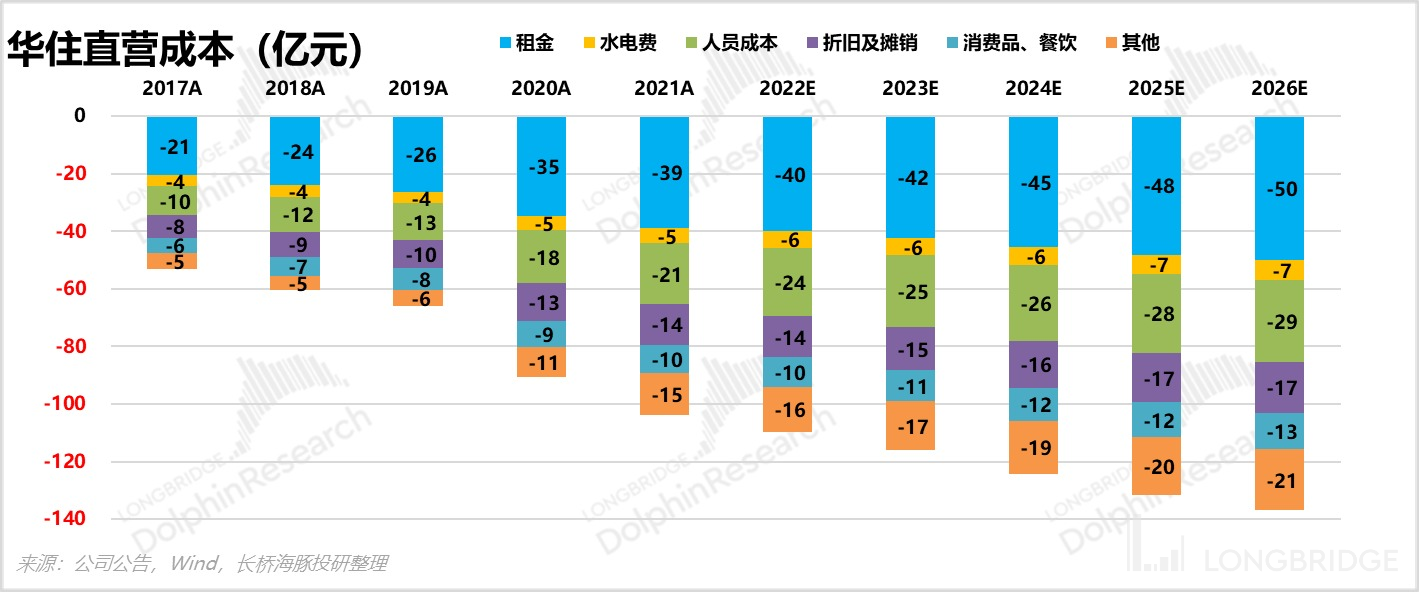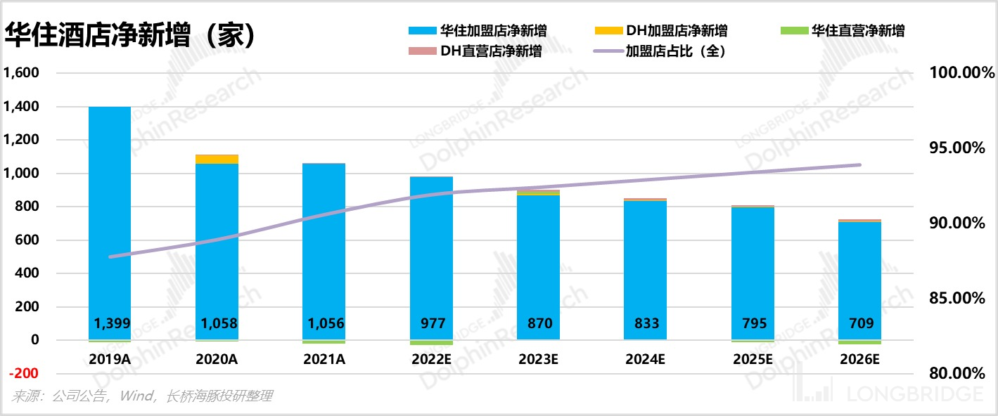 假设未来五年(2022-2026 年)当中,华住受益于精益拓店及结构升级,保持现有的市占率,预计五年可净加 4200 家酒店。同时,按照过去几年华住直营店和加盟店的占比趋势,预计还可以保持这个趋势并且加盟占比以每年 0.5% 的速度提升(2022 年按照前三季度趋势提升 1.3%)。则对应年份的直营店和加盟店的数量如下图所示:直营店的开设主要以 DH 为主,而华住国内主要是新增加盟店。