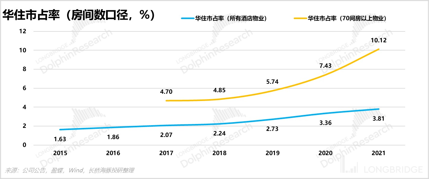 关于这三个问题海豚君是这么思考的:第一个问题在上篇中海豚君就有分析过,即使是仅仅把连锁化的目标放在 70 间房以上的物业,那么通过未来五到七年的时间,假设这一类型的连锁化率由现在的五成提升至八成(该类型物业非常标准,连锁化率提升很快),华住保持现有的市占率提升趋势即可做到 4 千家的新增(市占率可提升至 15%,行业市占率为 6%),如果按照龙头市占愈发集中的逻辑,华住要做到 6 千家的新增也是有可能的(市占率可提升至 18%,行业市占率可提升至 7%)。何况在未来几年的发展当中,完全有可能摸索出 40-70 间房的物业的可行性办法,有效行业空间将会扩大一倍(目前也有龙头品牌运营管理该类物业,但是数量极少,盈利能力不佳)。