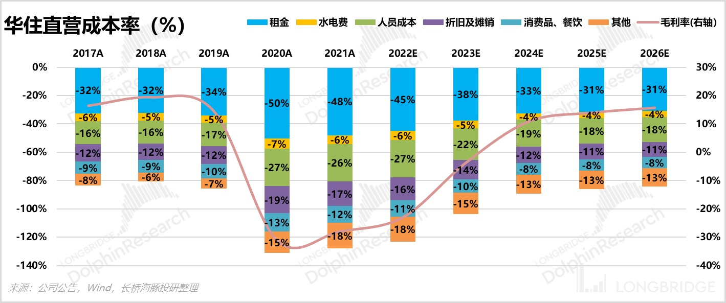 酒店的总成本主要集中在直营业务,而在 2020-2022 年,单位房间成本的变动没有太大,但是由于入住率不足的影响,导致租金摊销等刚性成本率猛然跳增。我们结合今年前三季度的表现推出今年各项成本率均有一定水平降低,但是还未覆盖直营收入。预计未来两年会逐步恢复到 2019 年疫情前水平。