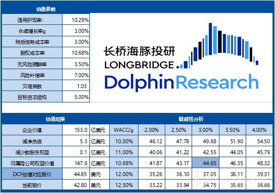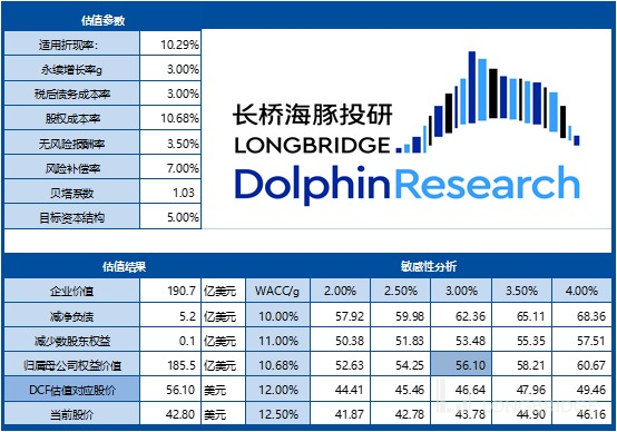 按照 WACC=10.68%,g=3.0% 的假设,乐观预期下,DCF 估值结果为 56.10 美元/股,对应 2024 年的净利润,隐含 PE 28x,EV/EBITDA 为 17 倍,潜在空间 30%。