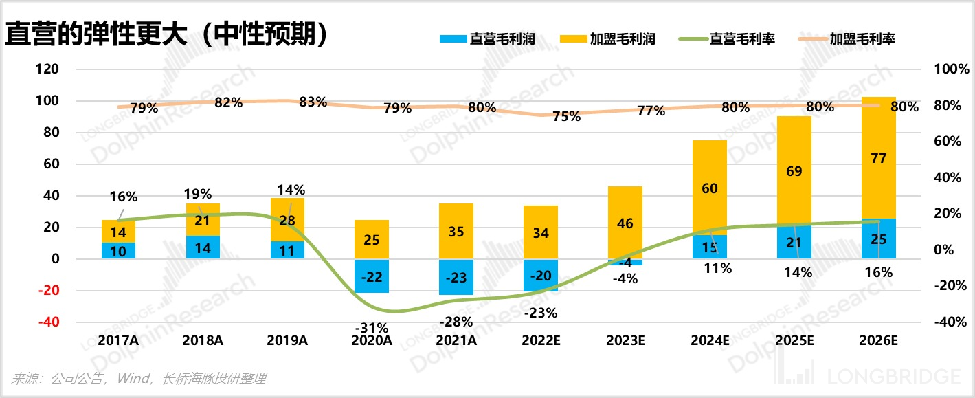 基于乐观假设,未来一年即刻恢复到 2019 年疫情前水平,则直营收入五年的 CAGR 可以达到 17%,加盟业务可以达到 19%,加盟收入的占比也是持续在提高。相应的,各项成本和费用也即刻恢复到 2019 年水平。