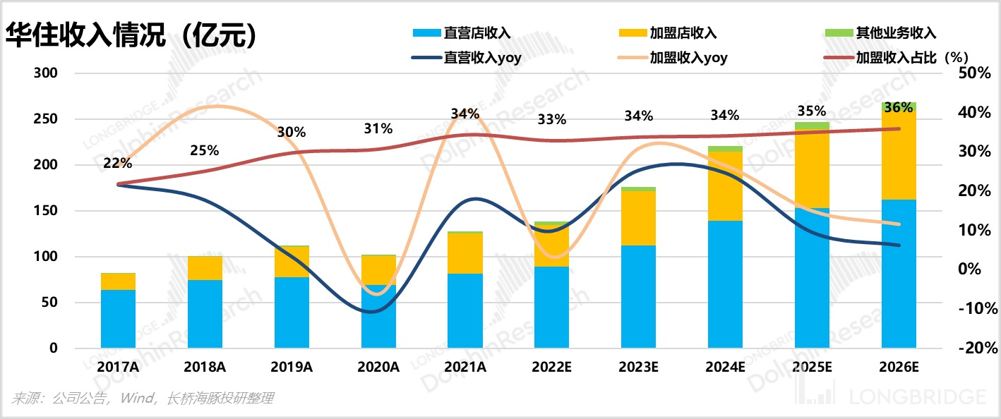 在这样的假设基础之下,华住加盟店的占比收入会进一步提升,未来五年直营业务收入的 Cagr 能达到 15%,而加盟业务能达到 17%。