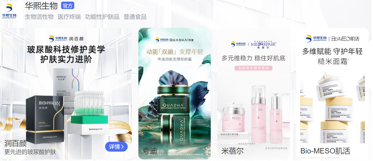 在产品端,华熙生物提供量肤定制的护肤解决方案,以满足不同消费者的护肤需求,如今华熙生物形成了以润百颜、夸迪、米蓓尔、BM肌活四大品牌矩阵为主,润月雅、珂岸、润熙禾、润熙泉等多品牌协同发展的格局。其中,润百颜专研玻尿酸科技护肤,主打“HA+X”的智慧配方理念;夸迪定位硬核抗老,主打冻龄抗初老市场;BM肌活专研发酵,致力成为“发酵护肤第一品牌”;米蓓尔专研敏感肌、分级护理。