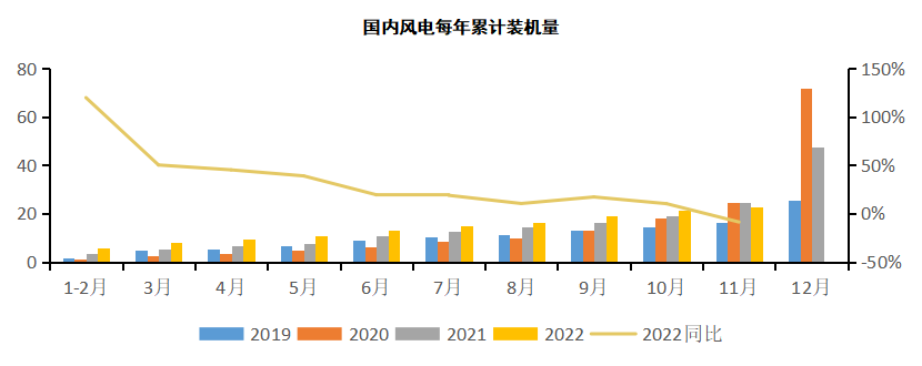 从装机量的数据来看,风电产业2022年高开低走,1-11月装机22.52GW,同比下降8.83%。不过,照以往的惯例来看,12月是并网的高发期,业内给出50-55GW全年较为乐观的装机预期。