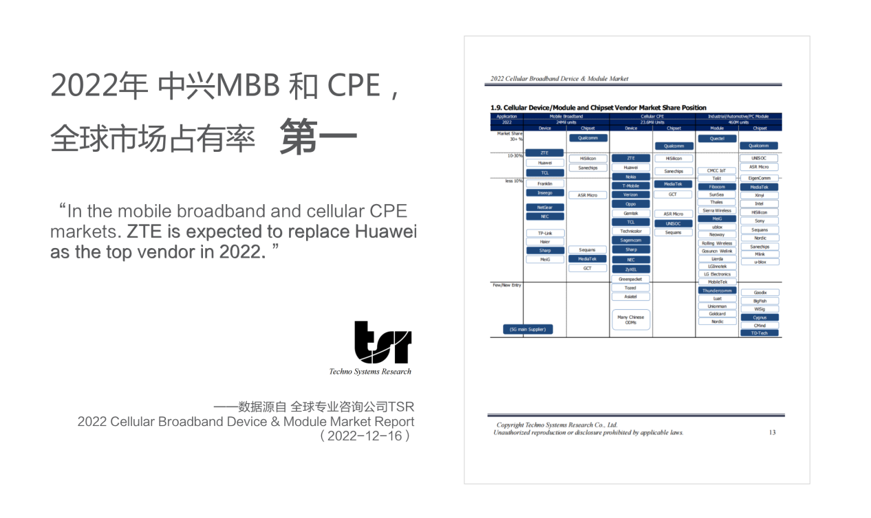 据国际专业咨询公司TSR 最新报告显示:2022年中兴通讯MBB & CPE产品市占率将超越华为坐稳全球第一把交椅。 MBB(移动宽带)产品连续两年保持第一;cellular CPE(包括LTE和5G产品)全球市占率第一。