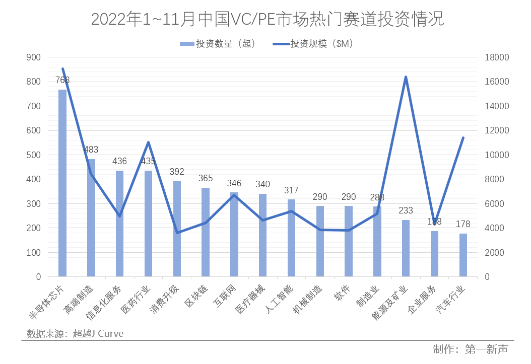 不投消费投什么?硬科技成为新的资金出口。据第一新声跟踪调研,去年前三季度,一级市场获得投资金额最多的前三大行业分别为半导体、电子设备、生物技术、医疗健康及IT。今年1~11月,半导体芯片以170.39亿美元的投资规模和768次投资数量,成为众多细分行业中的最热门赛道,高端制造投资数量为全部细分赛道第二高,共483起。