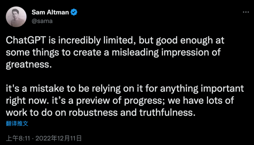 “ChatGPT的局限性令人难以置信,但在某些方面足够出色,足以给人一种强烈的误导印象。现在依赖它来做任何重要的事情都是错误的。它是一个项目的DEMO;我们在稳健性和真实性方面还有很多工作要做。”Sam Altman在社交媒体上如此表示。