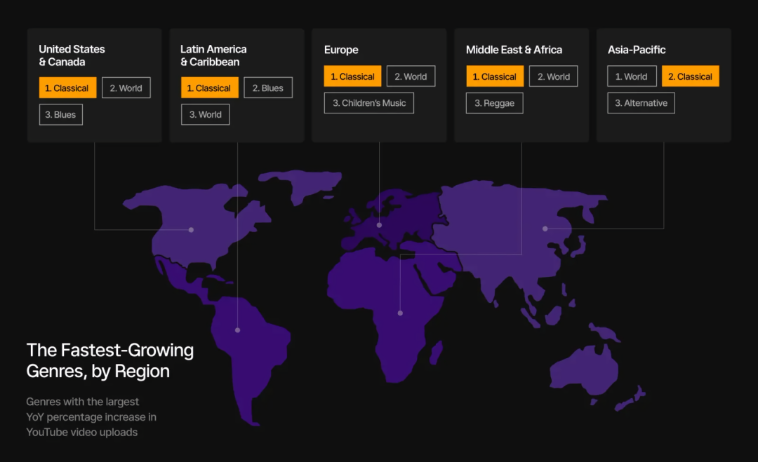 据Epidemic Sound最近发布的年度报告,2022年,古典乐在YouTube上的使用量增加了90%以上。并且,这是一个全球性的趋势。无论是在欧洲、美洲还是中东和非洲,古典乐都是去年YouTube上传视频中增速最快的配乐类型。