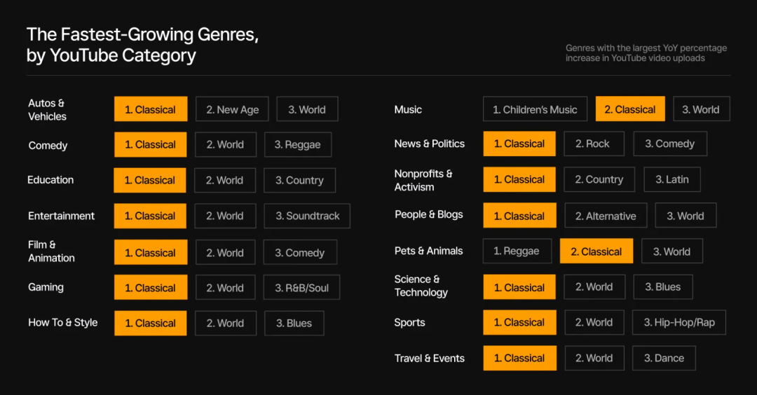 由此,古典乐几乎能适配所有类型的视频内容。在去年,不论是戏剧、教育、娱乐、游戏还是政治、科技、运动、旅行,古典乐的使用量同比增长都是最高的。