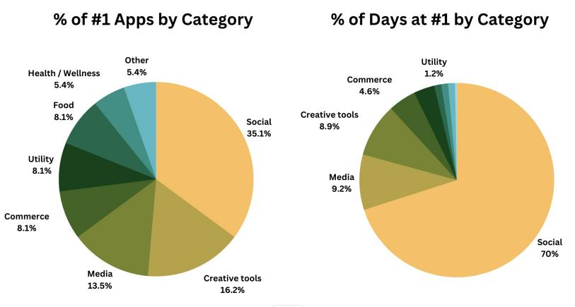 各个品类登顶美榜的 App 数量以及登顶天数