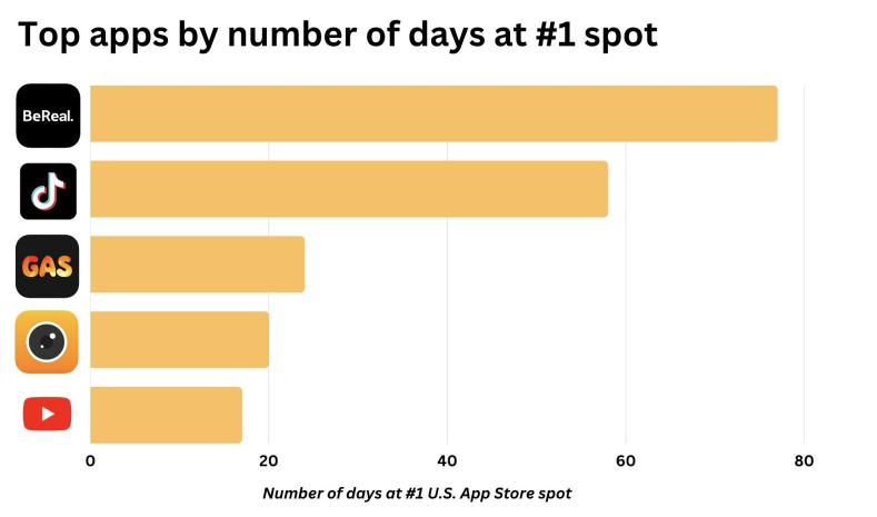 在 2022 年异军突起的 BeReal 超越了 TikTok,成为 2022 年登顶美国 iOS 下载榜天数最多的 App。根据数据显示,BeReal 霸榜的天数占到全年的 22%,排名第二的 TikTok 则占比 17%。值得一提的是,TikTok 在 2022 年登顶的天数与 2021 年时相比有明显下滑,与今年的 17% 相比,去年登顶天数达到 53%。而且,自今年 7 月 17 日以来,TikTok 就再也没有登顶美国 iOS 下载总榜。