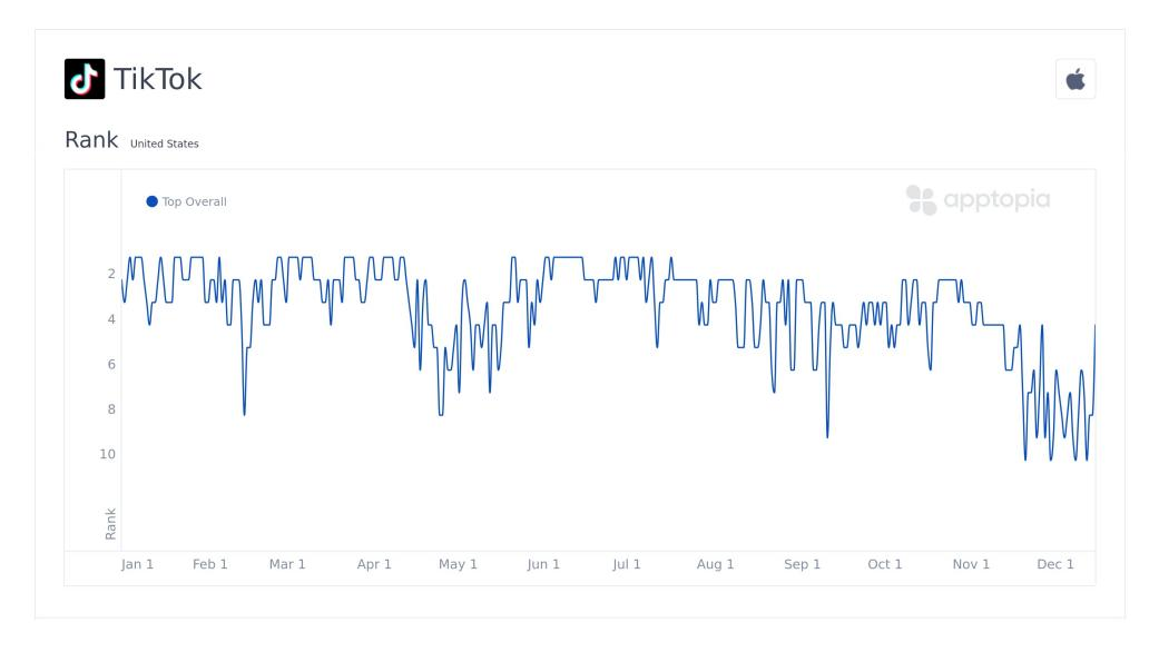 2022 年 TikTok 在美国 iOS 免费下载榜上的排名变化趋势丨数据来源:Apptopia