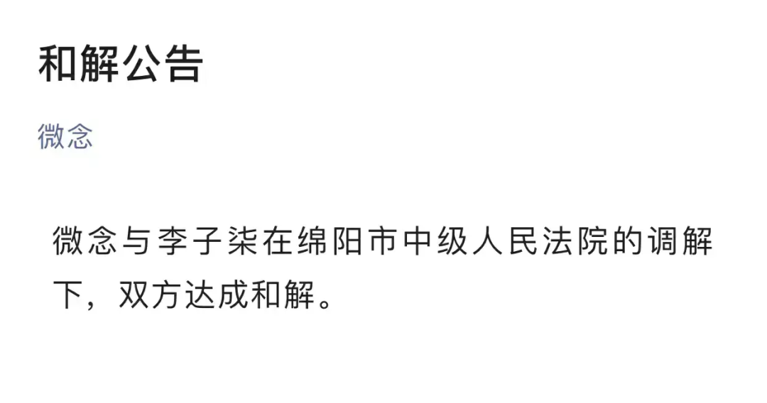 像是有意选择的一个时刻,12月27日午间12点整,微念发布了一则简短《和解公告》:微念与李子柒在绵阳市中级人民法院的调解下,双方达成和解。