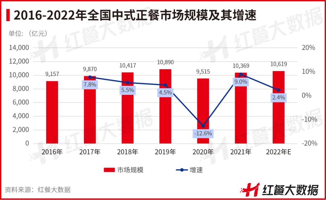 红餐大数据显示,2021年中式正餐的市场规模达到1.04万亿元,较2020年增长9.0%,但仍未恢复到2019年疫情前的水平。进入2022年,国内的疫情呈现多点散发频发的态势,中式正餐受到一定的影响,预估全国中式正餐的市场规模将较2021年微弱上涨或持平。