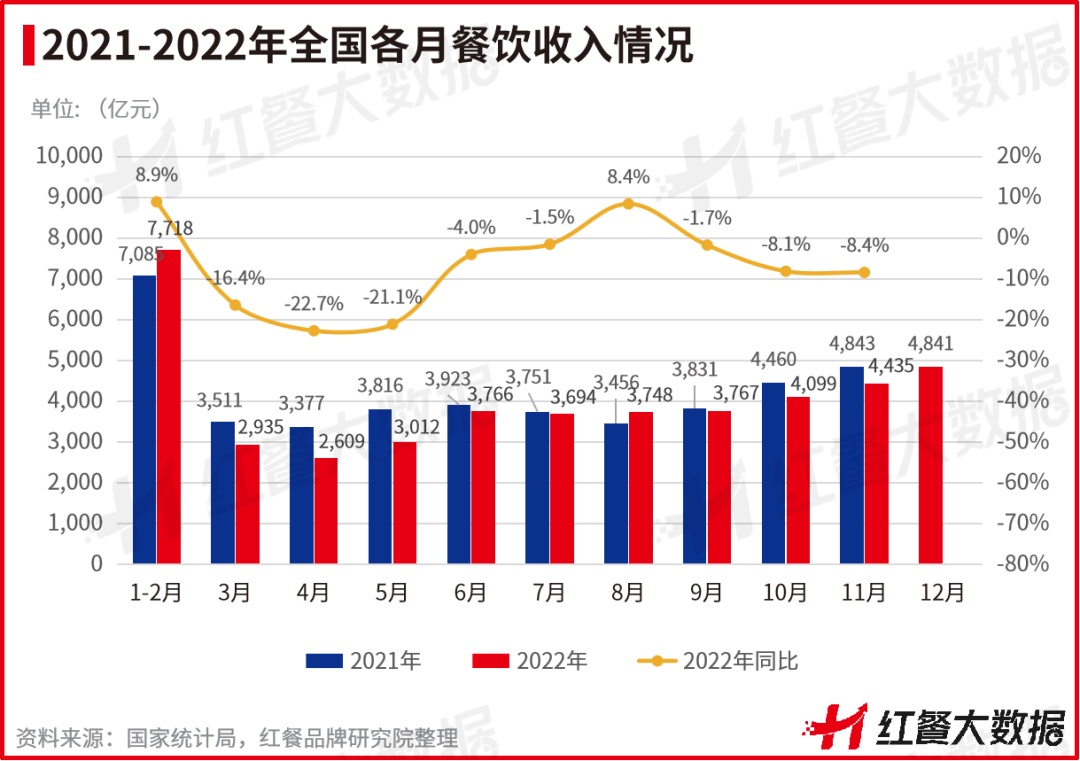 2022年,受多点散发频发的疫情影响,我国餐饮市场持续承压。据国家统计局公布的数据,今年4月、5月全国餐饮收入同比下降超过20%。随着各省市促进餐饮消费的政策纷纷出台,6月、7月全国餐饮收入同比降幅分别收窄至4.0%、1.5%。8月份全国餐饮收入为3,748亿元,同比增长8.4%,是自今年3月份以来首次实现正增长。