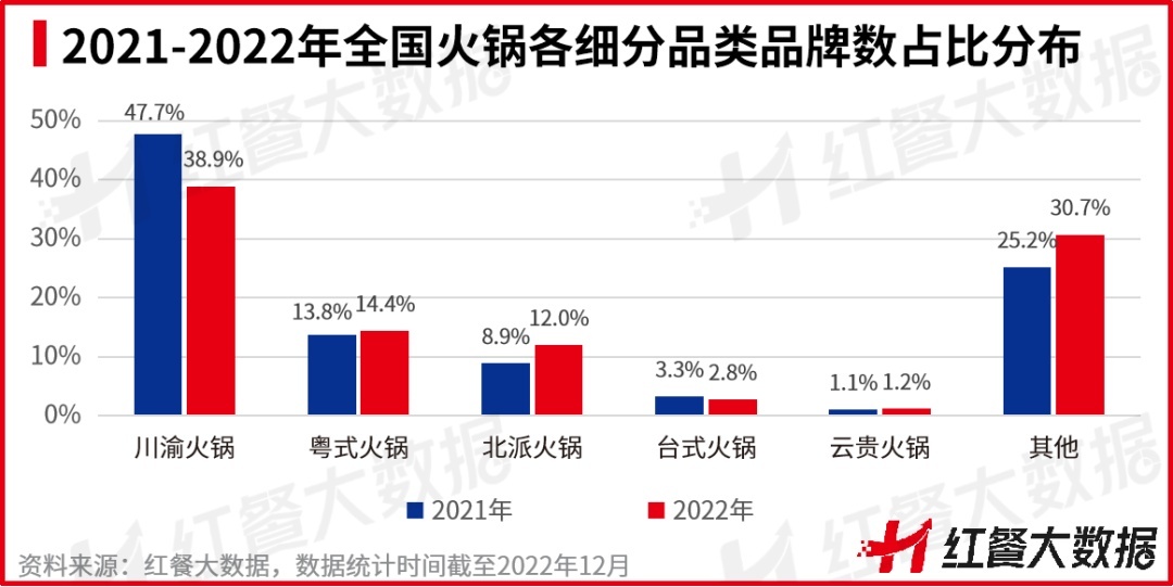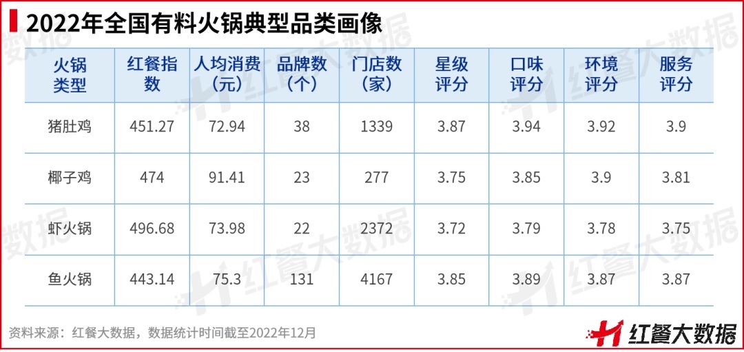 从细分品类来看,红餐大数据显示,粤式火锅品牌数占比在上涨,扩张态势明显,其2022年的红餐指数也是火锅品类中最高的,其中的猪肚鸡,椰子鸡和牛肉火锅近两年表现比较突出,川渝火锅以外的其他细分火锅品类的品牌数占比增高也比较明显。