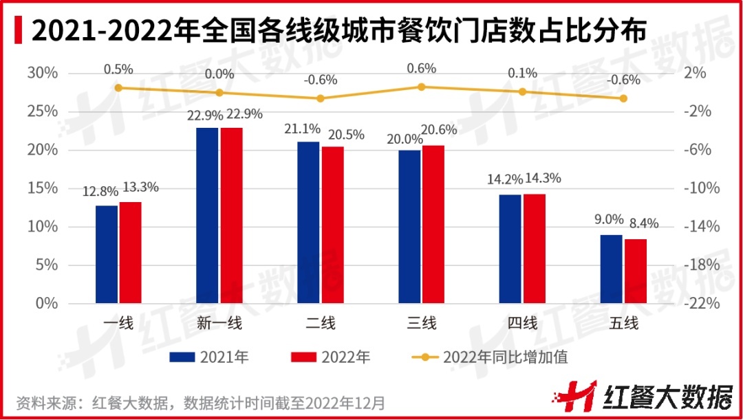据红餐大数据,2022年一线、三线、四线城市连锁餐饮门店数的占比相较2021年均有所上升,其中一线城市占比是13.3%,较上年增长0.5个百分点;三线城市为20.6%,较上年增长0.6个百分点;四线城市占比是14.3%,较上年增长0.1个百分点;新一线城市的连锁餐饮门店数占比较上年持平,为22.9%;而二线、五线城市占比略有收缩,分别为20.5%和8.4%,均较上年缩减0.6个百分点。